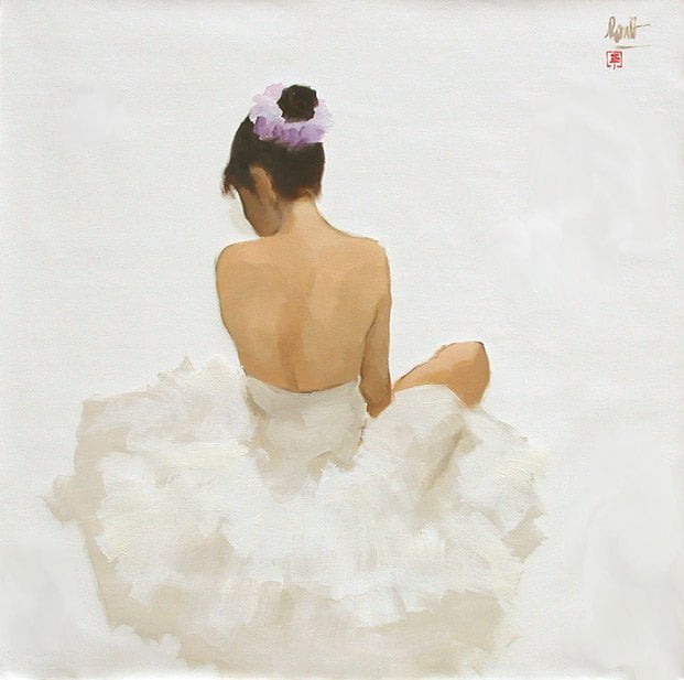 Contemplando a imagem anterior, percebemos que, além de conteúdo puramente pictórico, o artista nos oferece um momento de delicada sensibilidade ao nos apresentar o torso de uma jovem bailarina em descanso. Notável também é a assinatura vermelha discretamente localizada à direita, no topo. Como percebemos, existem graus de minimalismo, desde a flébil emotividade de Malevich à pureza espiritual de Bihn.