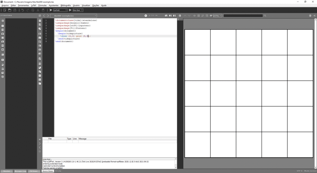 Um exemplo: vamos criar uma malha quadriculada que será extensamente utilizada em nossas ilustrações. Digite a linha draw (0,0) grid (5,5); dentro do bloco tikzpicture: