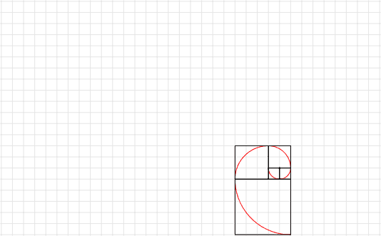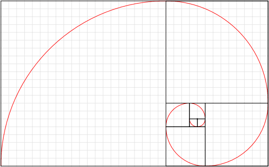 \draw [red] (-1,0) arc (180:270:1) arc (270:360:1) arc (0:90:2) arc (90:180:3) arc (180:270:5) arc (270:360:8) arc (0:90:13) arc (90:180:21);